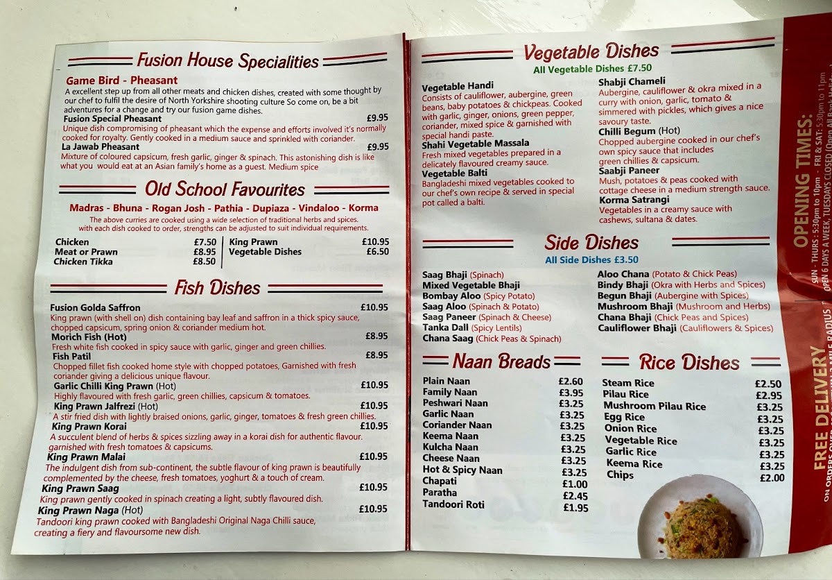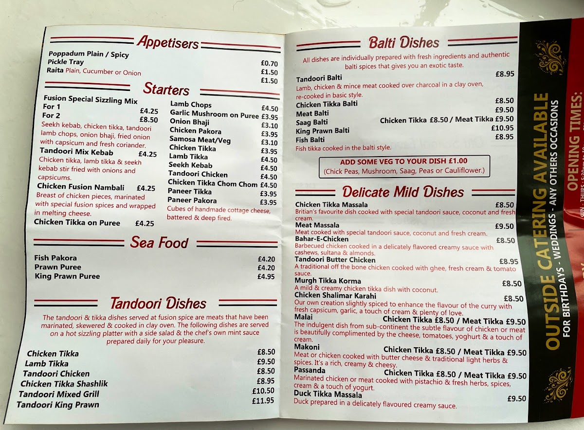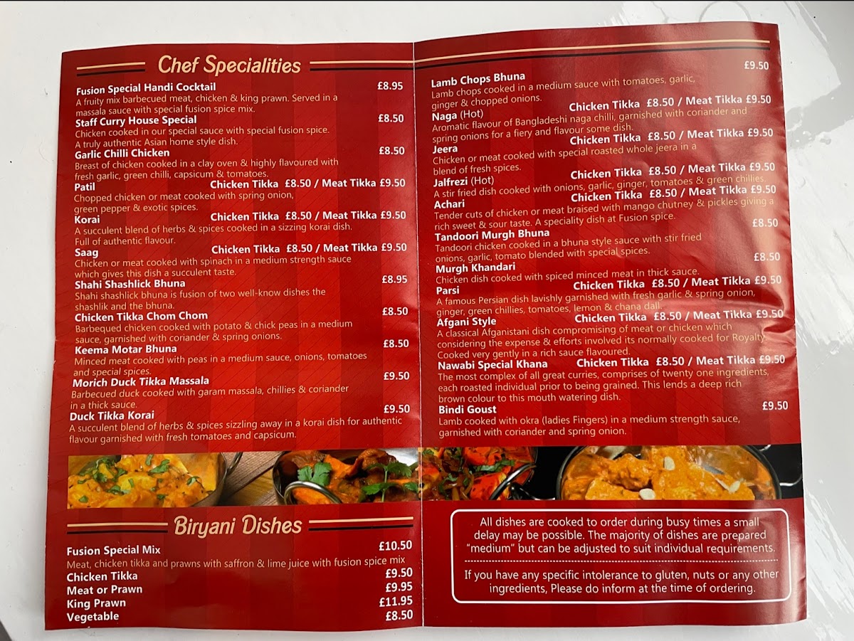 From a reviewer’s perspective, the menu at Fusion Spice offers a concise yet intriguing selection that highlights both creativity and classic flavors. The Chef Specialities stand out, particularly the Fusion Special Handi Cocktail, which suggests a rich combination of house flavors, alongside the Staff Curry House Special, a dish that feels like a signature recommendation from the kitchen. The Garlic Chilli ChickenPatil adds a punchy, aromatic option for those who enjoy bold seasoning, while the Korai provides a more traditional curry experience. In the Biryani section, choices like King Prawn, Vegetable, and the Fusion Special MixChicken Tikka showcase a balanced range catering to seafood lovers, vegetarians, and those seeking a hearty mixed dish. Overall, the menu reflects a blend of familiar Indian cuisine with a personalized twist, leaving a positive impression despite the limited detail on pricing.